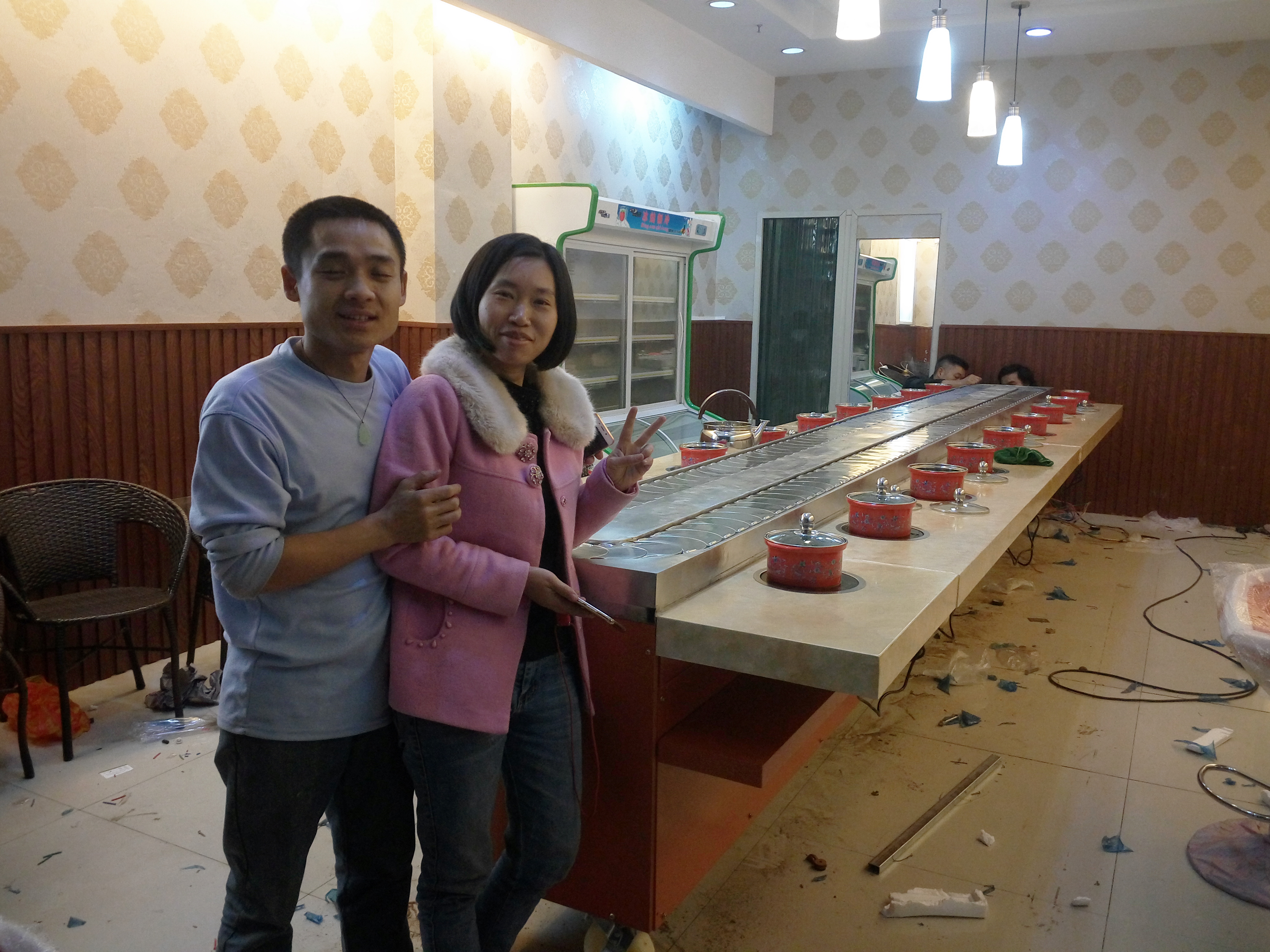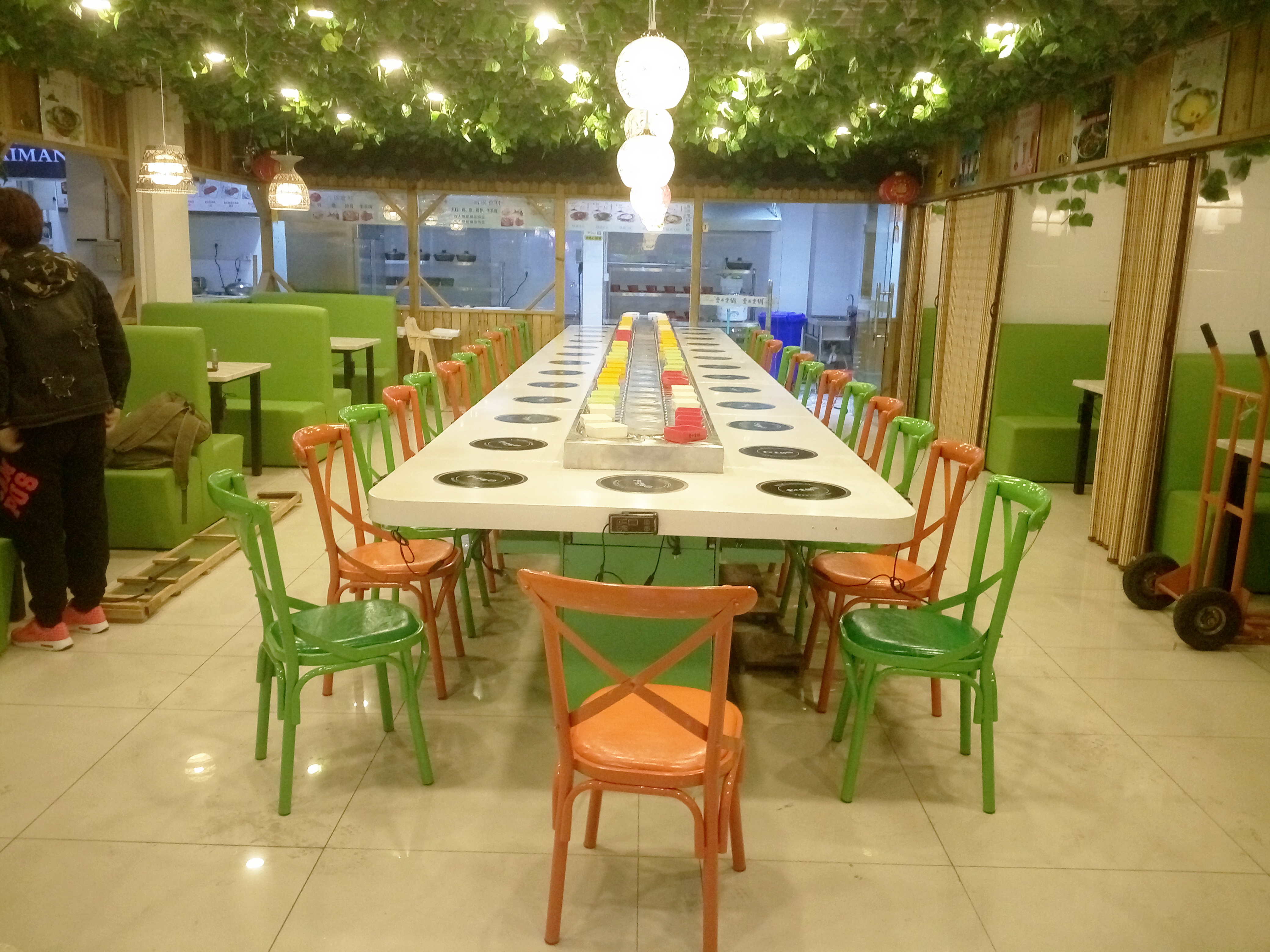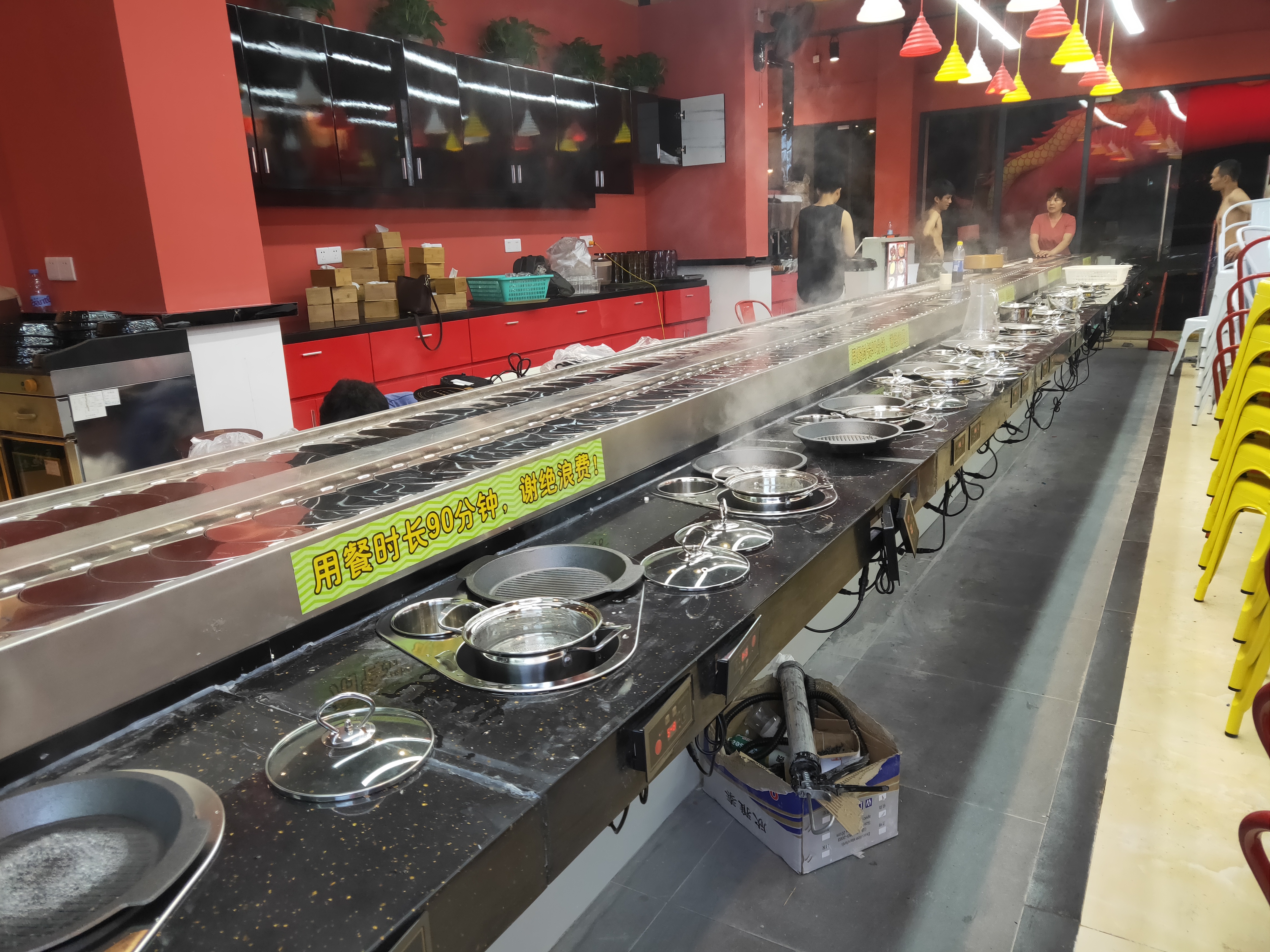 第四,菜叶子、肉渣掉进链轮齿槽。 客人夹菜时洒出来的残渣,顺着转盘掉进链轮和链条咬合的地方,干了之后硬得像石头,链条被顶起来就会跳齿卡顿。每天收档后拿气枪吹一遍链轮和轨道槽,比啥都管用。