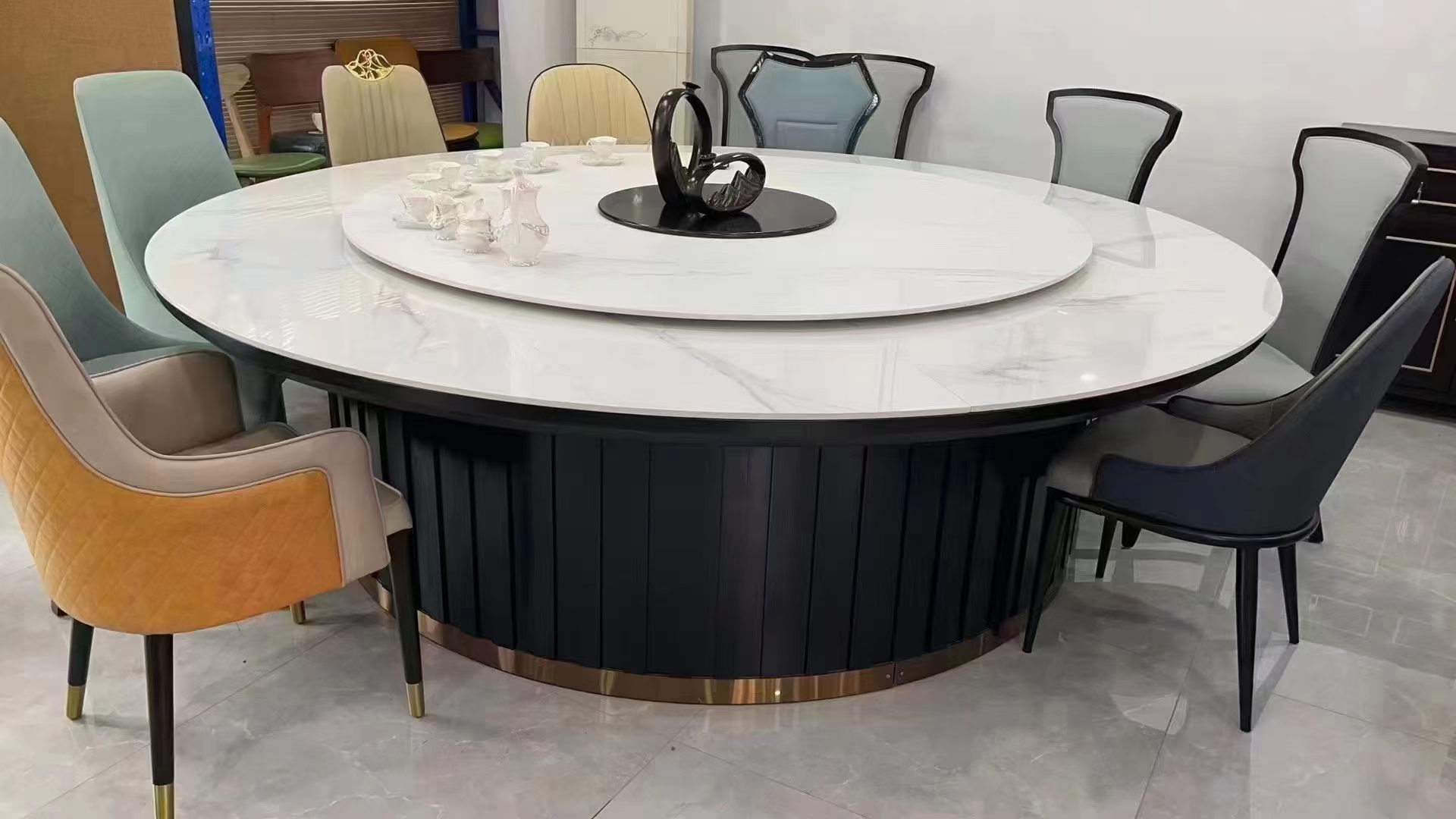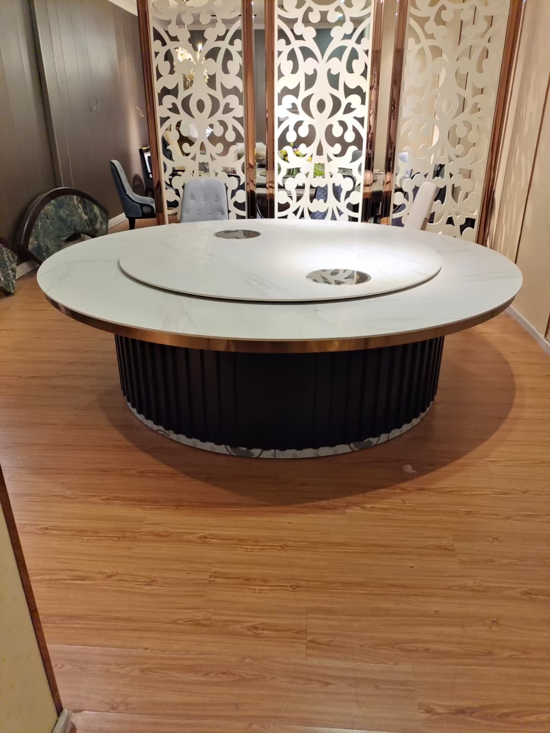 电机方面,多采用国产普通直流电机,功率在30-50W,转速可实现0.5-2r/min可调,噪音控制在55分贝以内,基本能满足日常用餐时的旋转需求,承重能力约80-120kg,可满足普通家庭聚餐、小型商务用餐的菜品摆放需求。尺寸上,这一区间的电动餐桌以中小型为主,常见直径为1.2m(4-6人座)、1.5m(6-8人座)、1.8m(8-10人座),部分厂家可提供简单的尺寸微调,无需额外支付定制费用。从批发政策来看,多数厂家要求基础款电动餐桌批发量≥5张即可享受批发价,批量达到10张以上可享受5%-8%的优惠,部分佛山、赣州等家具产地的厂家,针对基础款产品还可提供免费送货到物流点的服务,进一步降低采购商的运输成本。需要注意的是,这一区间的产品核心优势是性价比高,适合预算有限、对产品质感和功能要求不高的采购场景,但材质和电机的耐用性相对一般,使用寿命通常在3-5年,后期可能出现电机噪音增大、桌面轻微变形等问题。